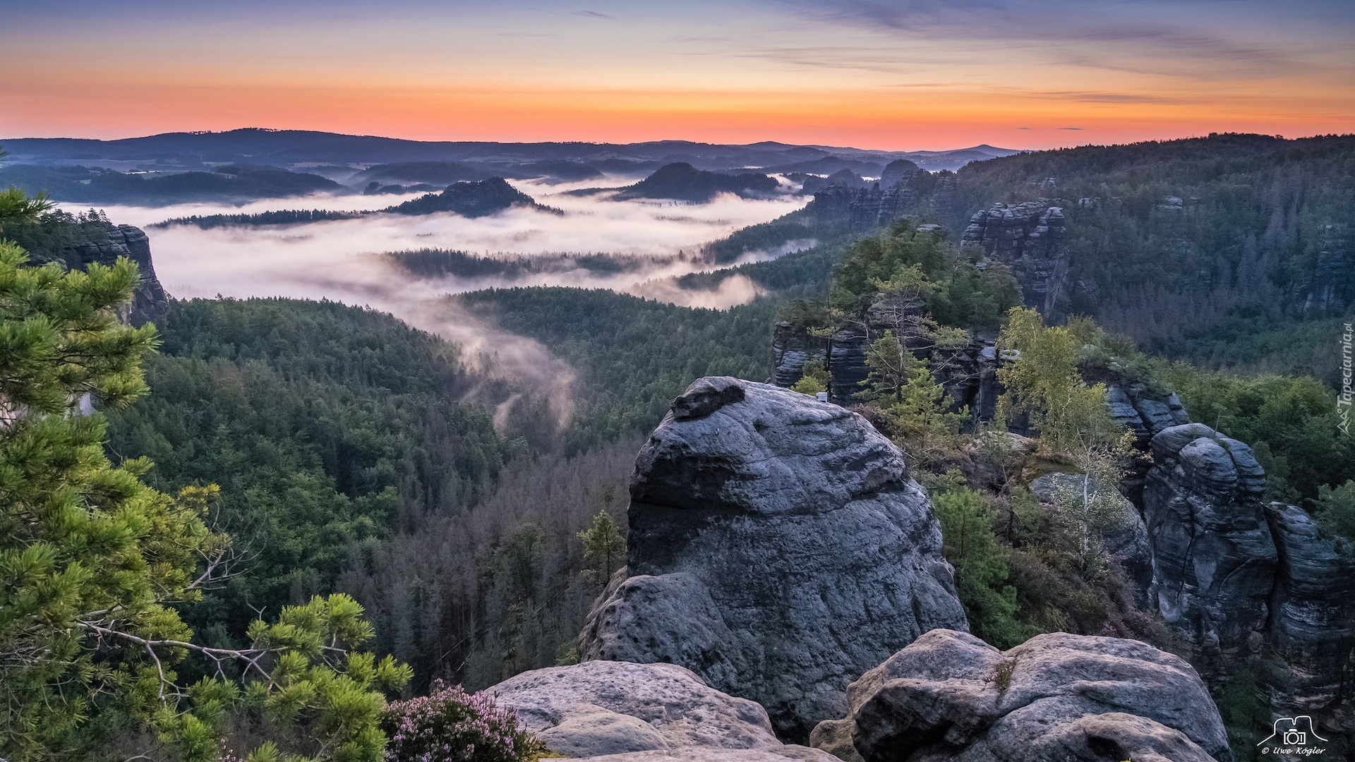 Tagi: Park Narodowy Saskiej Szwajcarii, Skały, Góry Połabskie, Lasy, Drzewa, Wschód słońca, Mgła, Niemcy