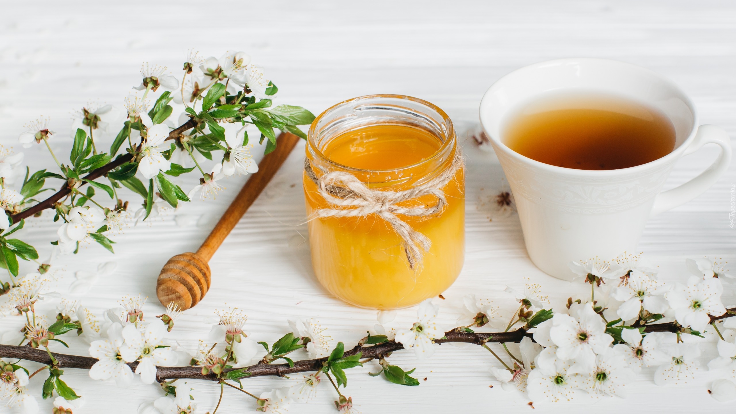 Herbata, Kubek, Słoik, Miód, Gałązki, Białe kwiatki