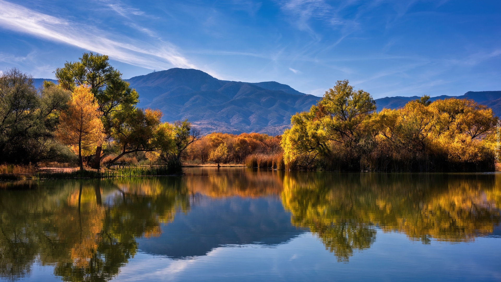 Tagi: Stany Zjednoczone, Utah, Park stanowy Dead Horse, Góry, Jezioro, Jesień, Drzewa, Odbicie