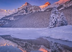 Jezioro Louise Lake na tle gór Skalistych zimową porą