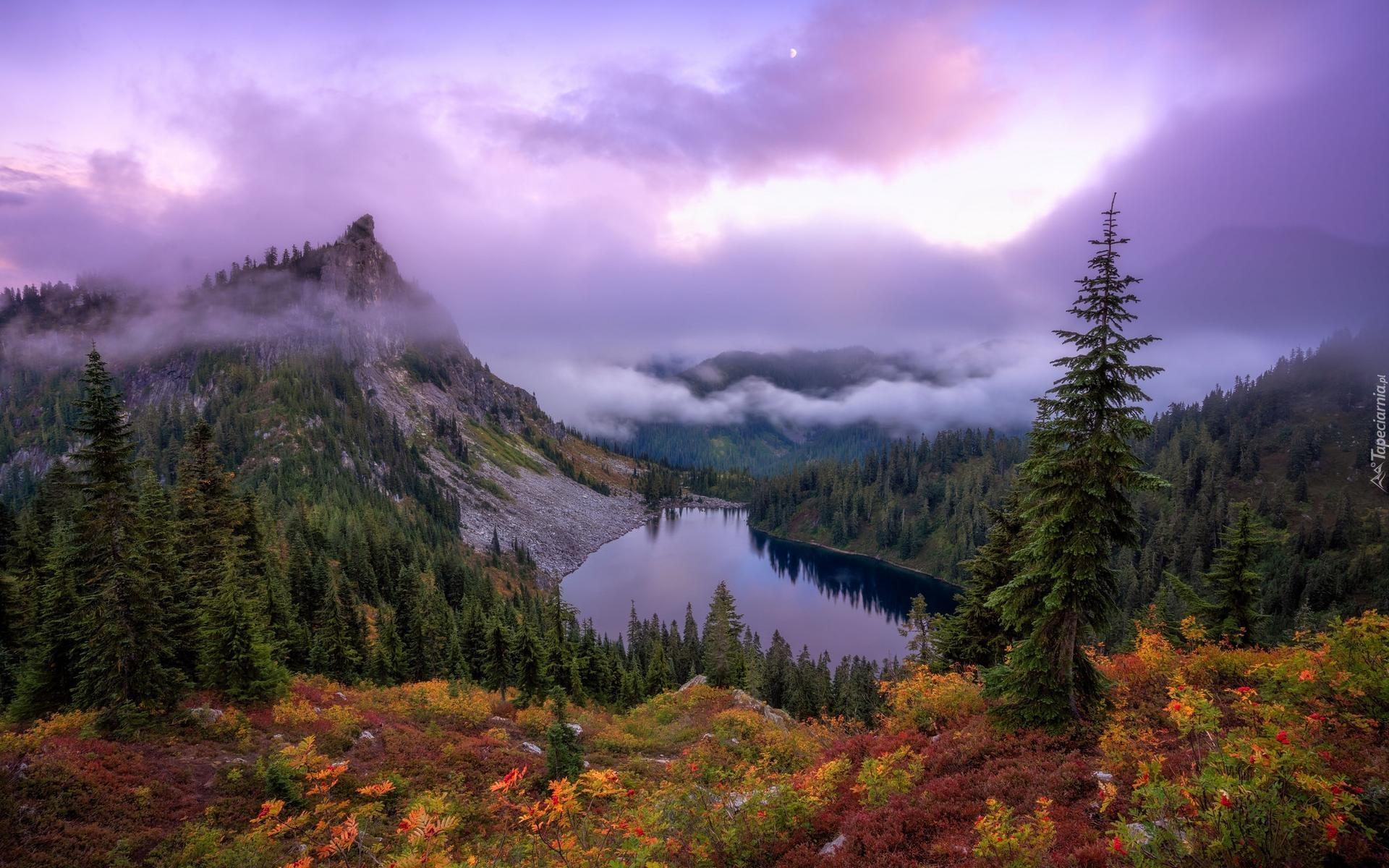 Tagi: Jezioro, Lake Valhalla, Góry Kaskadowe, Drzewa, Zieleń, Mgła, Chmury, Stan Waszyngton, Stany Zjednoczone