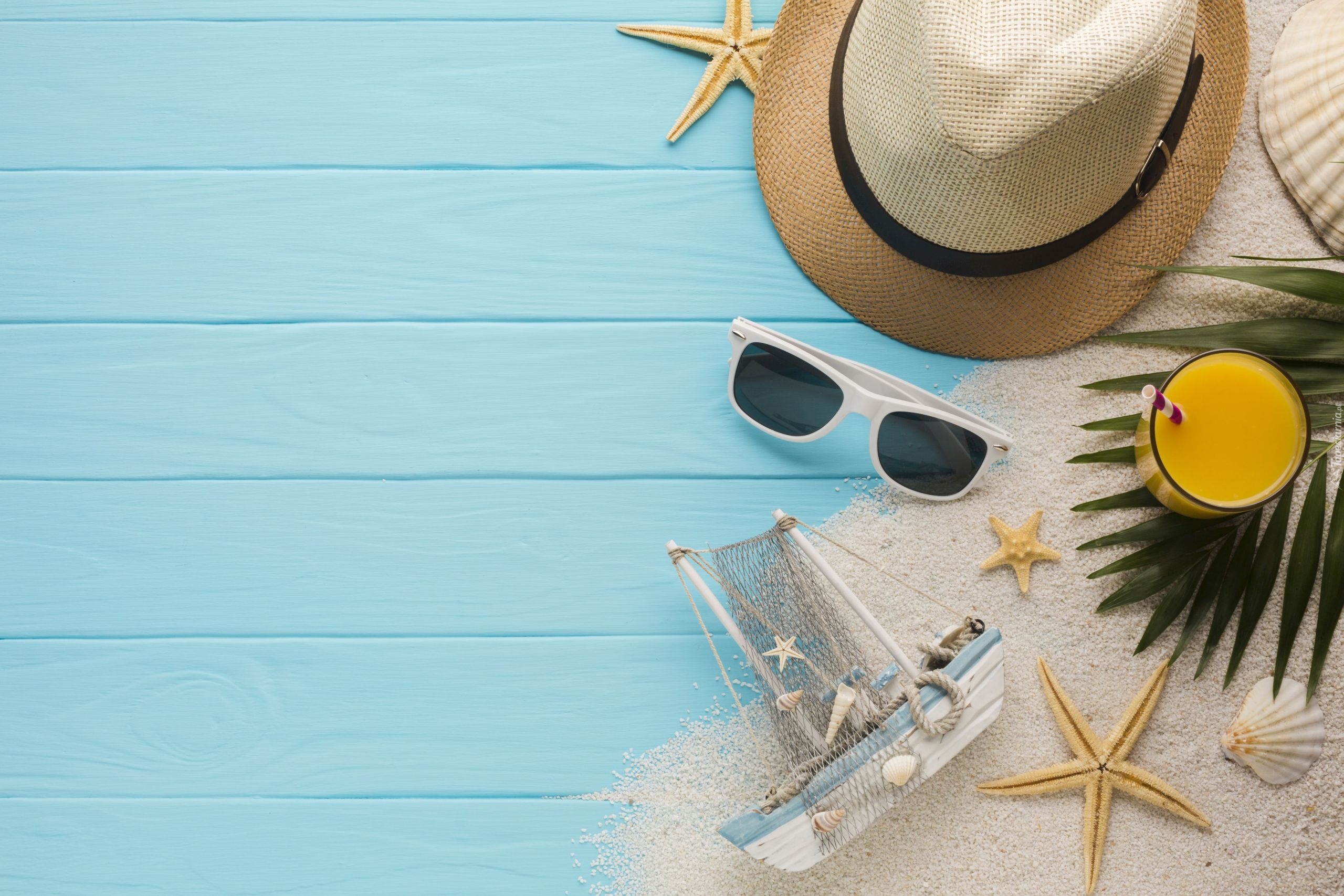 Kapelusz, Muszelki, Rozgwiazdy, Piasek, Okulary, Żaglówka, Sok, Liść, Wakacje