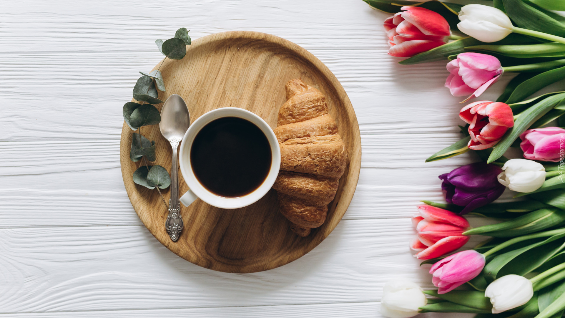 Kawa z rogalikiem na drewnianej tacy obok tulipanów