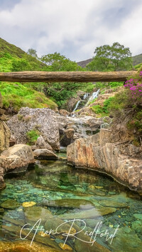 Tagi: Rzeka, Kładka, Kamienie, Skały, Trawa, Wzgórza, Drzewa, Rośliny