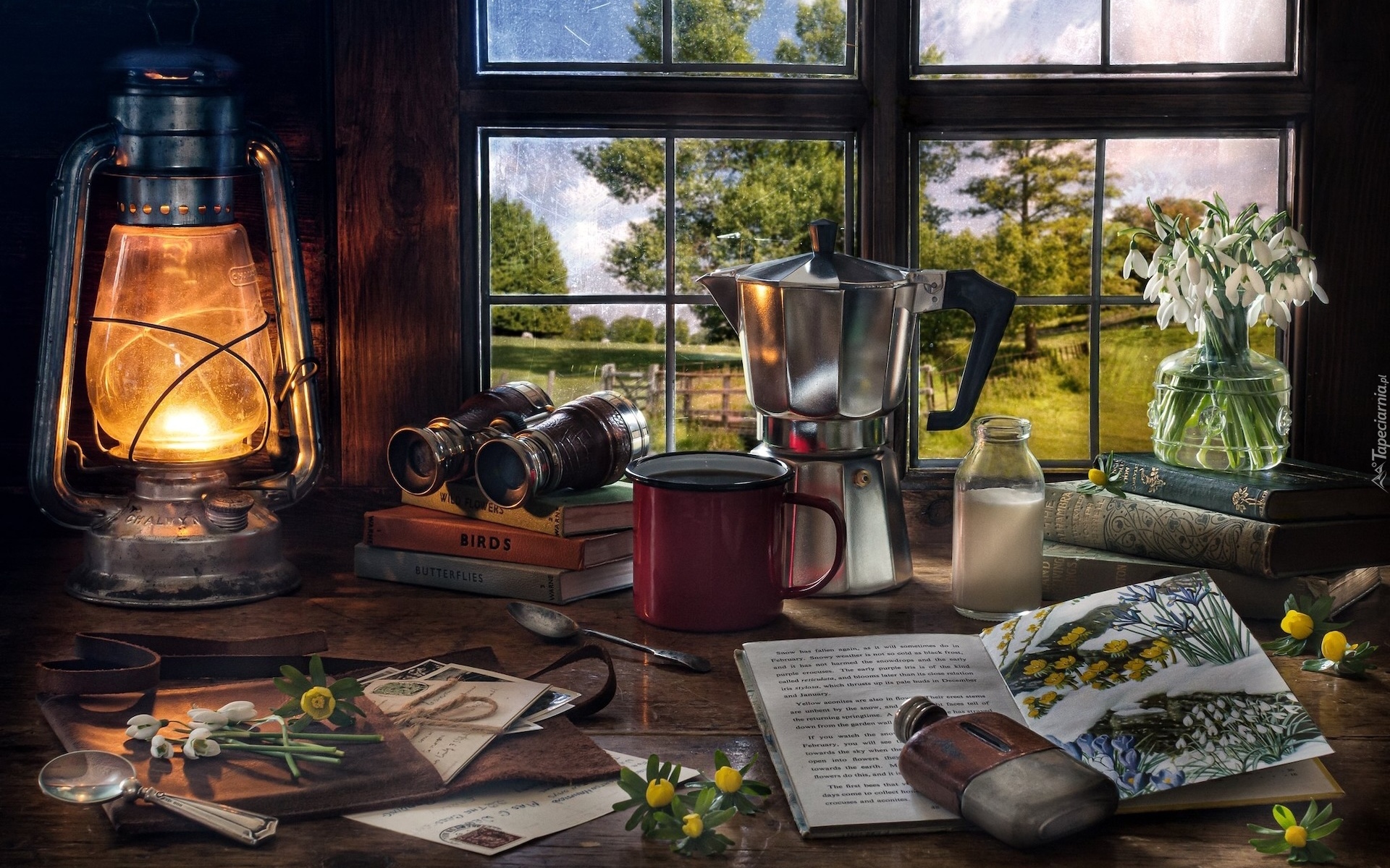 Kompozycja, Okno, Kwiaty, Przebiśniegi, Książki, Lampa, Kawiarka, Kubek