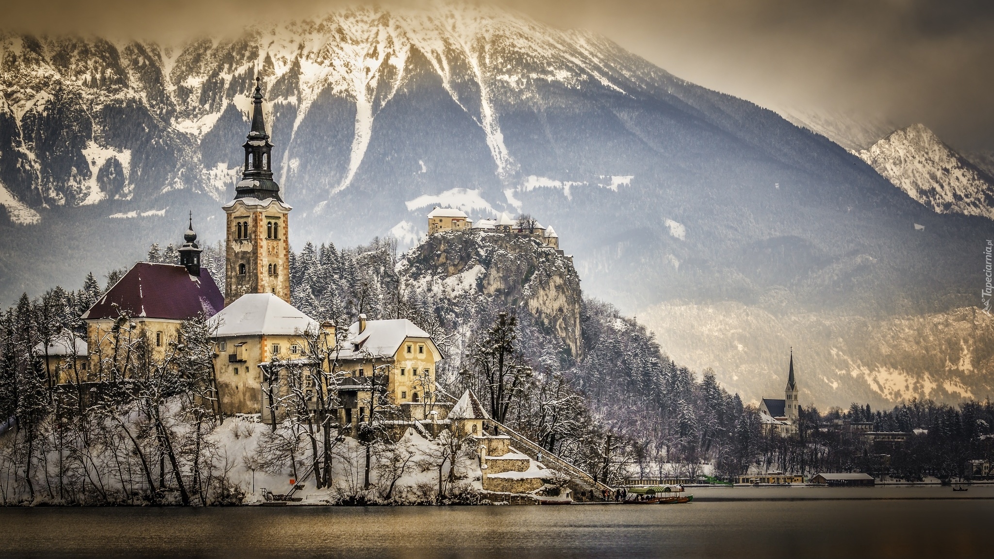 Tagi: Słowenia, Wyspa Blejski Otok, Jezioro Bled, Kościół Wniebowzięcia Marii Panny, Góry, Alpy Julijskie, Skały, Zamek Bled, Zima
