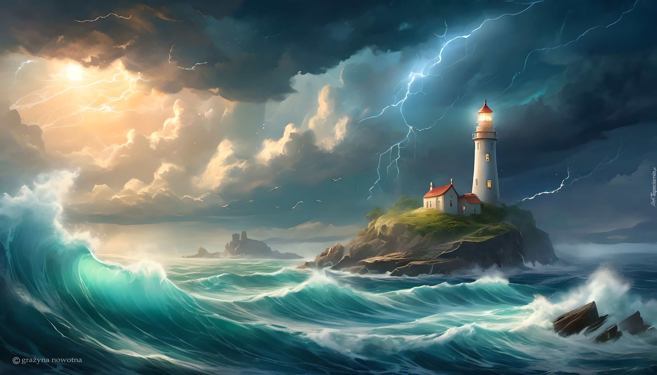 Tagi: Latarnia morska, Morze, Fale, Burza, Pioruny, Sztorm, Grafika