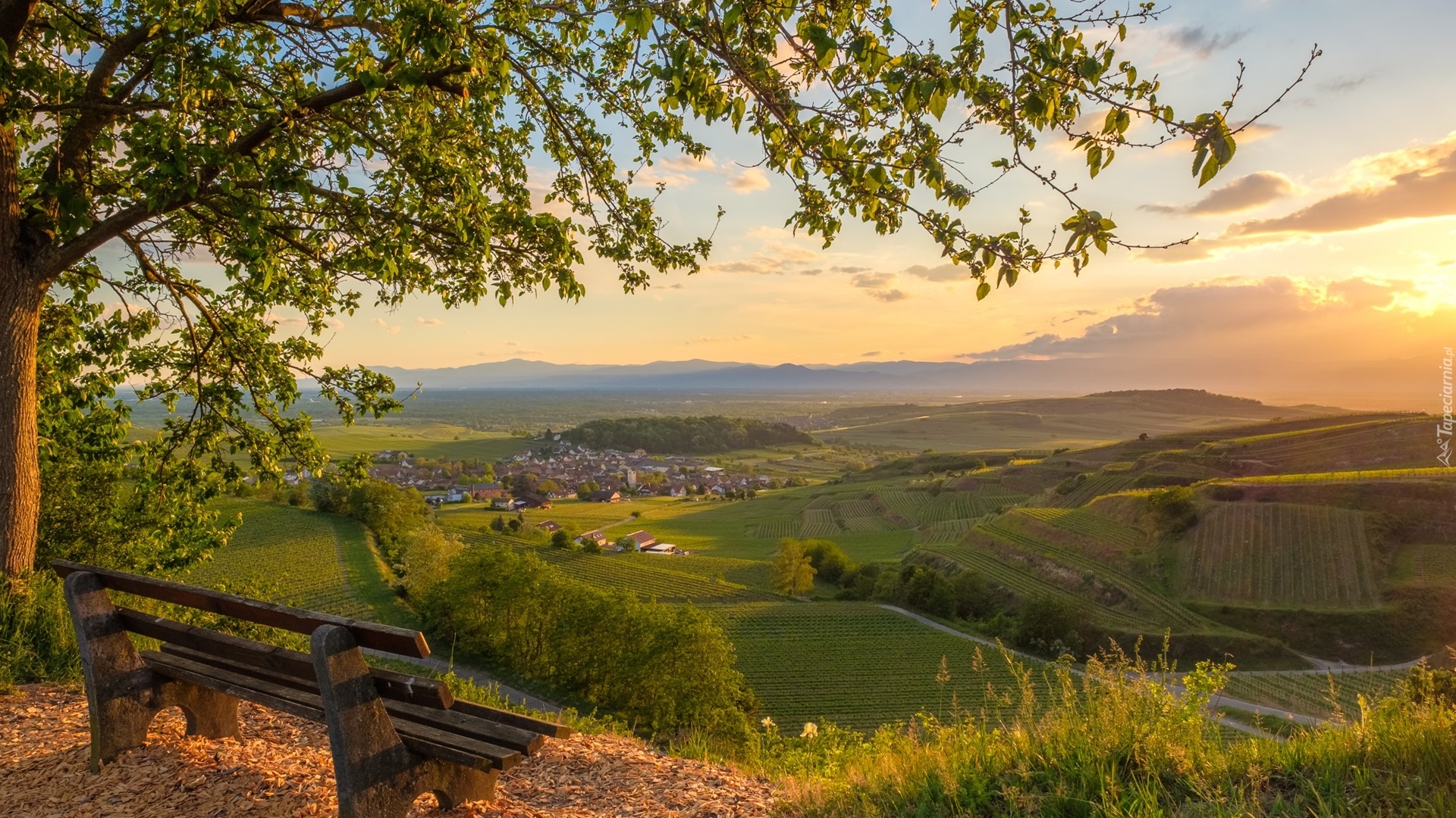 Tagi: Wzgórza, Kaiserstuhl, Drzewa, Ławka, Domy, Winnice, Wschód słońca, Badenia-Wirtembergia, Niemcy