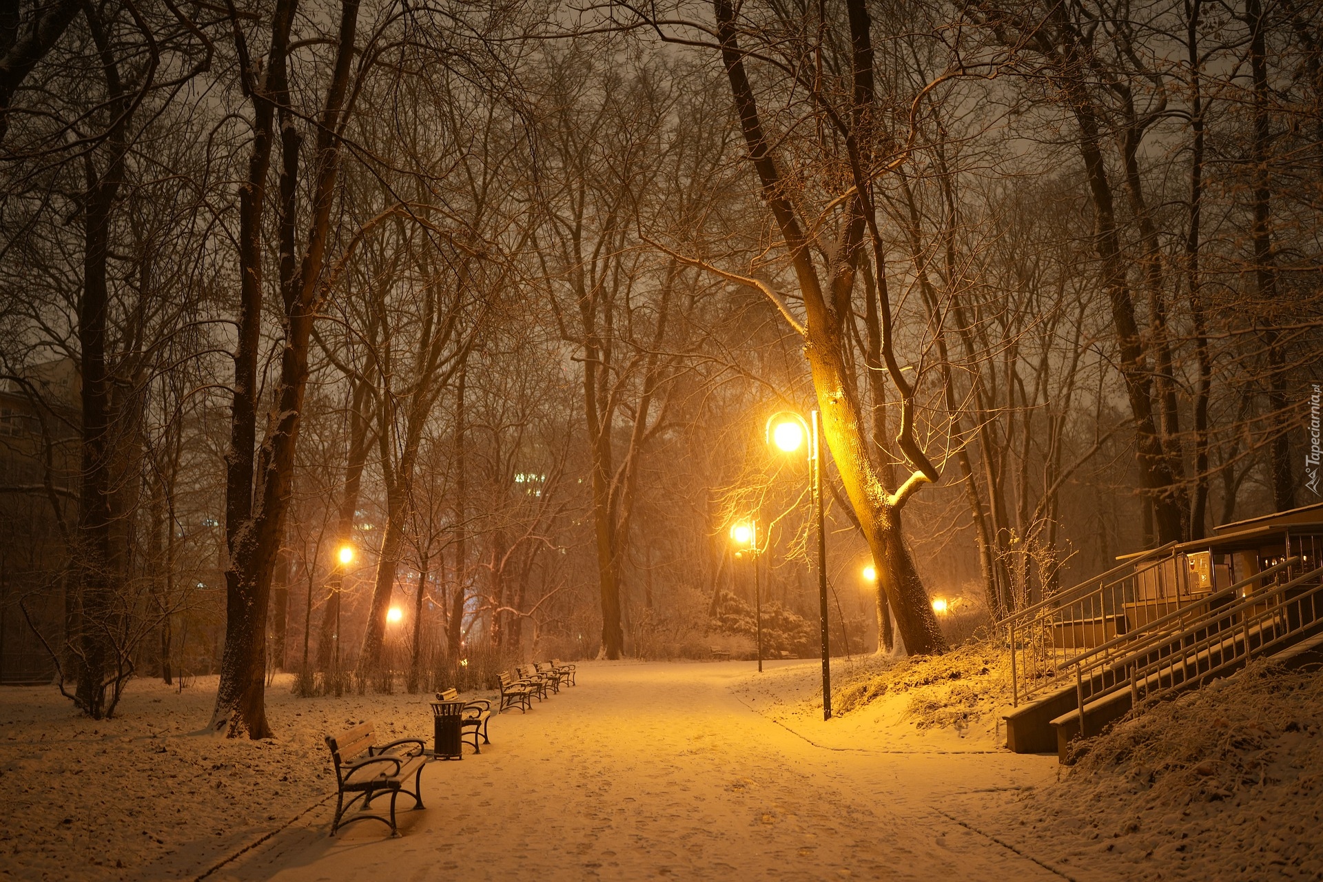 Tagi: Zima, Park, Noc, Latarnie, Drzewa