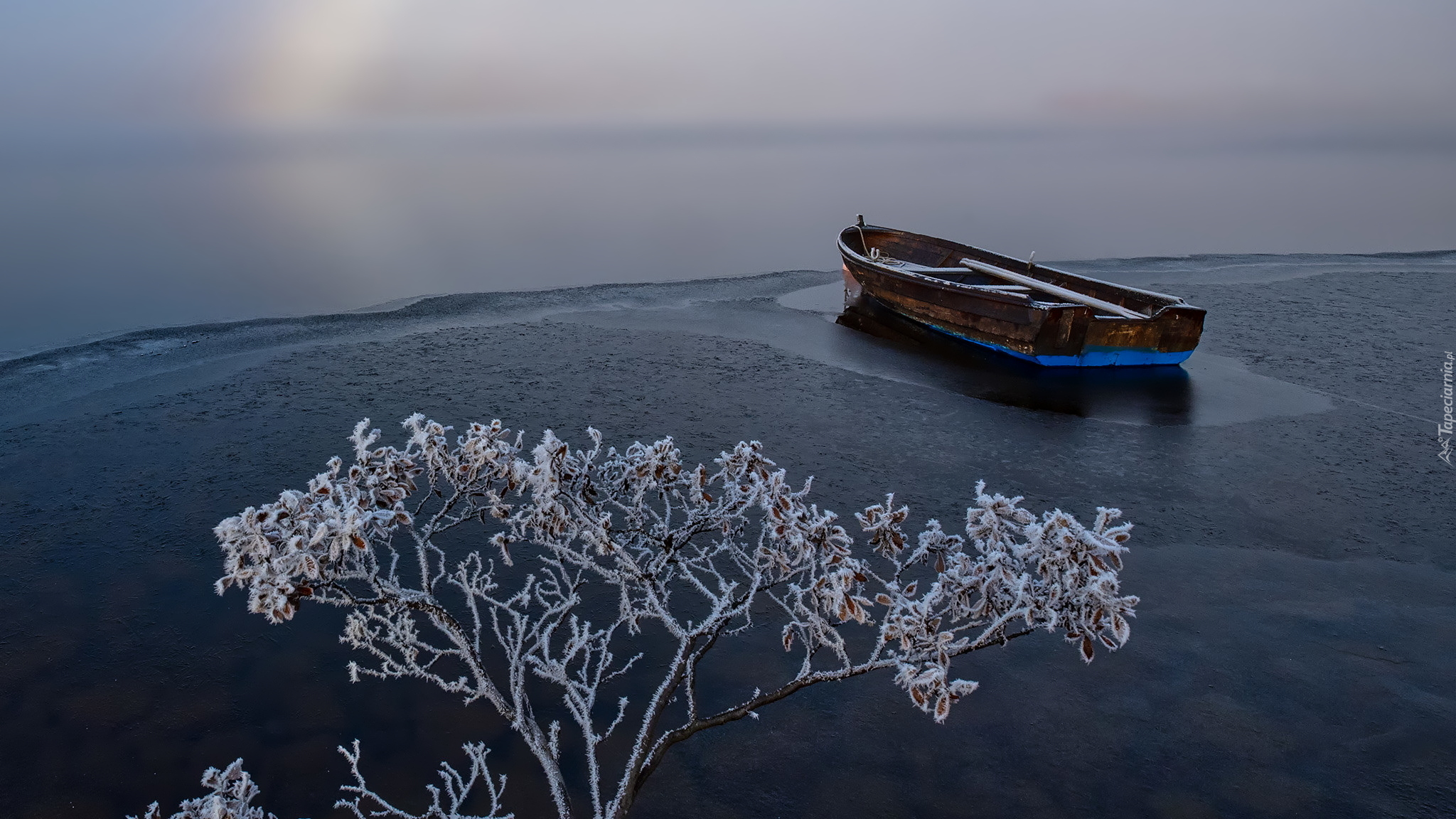 Tagi: Jezioro, Brzeg, Łódka, Ośnieżone, Gałęzie