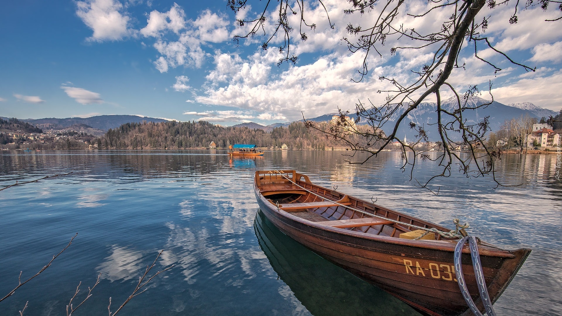 Tagi: Jezioro, Bled Lake, Łódka, Góry, Alpy Julijskie, Drzewa, Domy, Słowenia