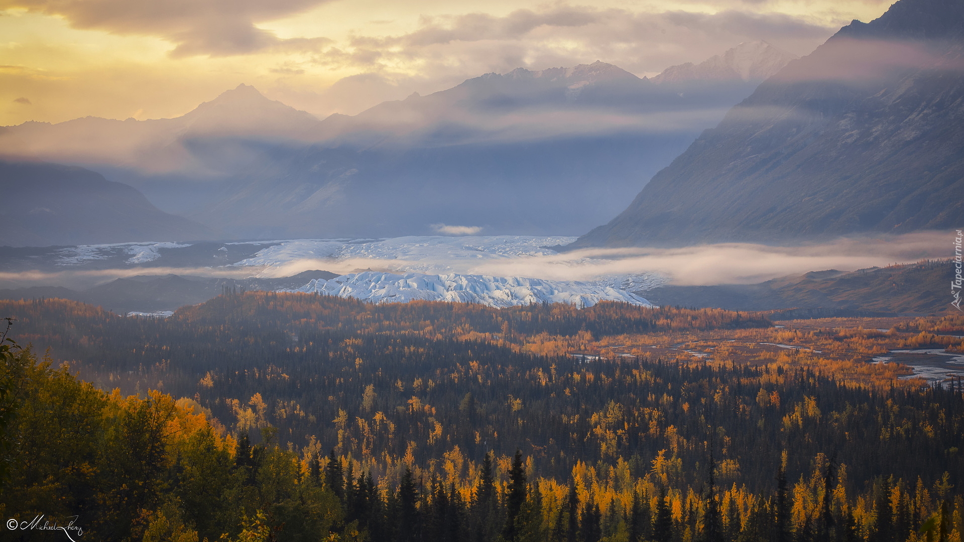 Tagi: Lodowiec Matanuska, Góry, Lasy, Jesienne, Drzewa, Alaska, Stany Zjednoczone