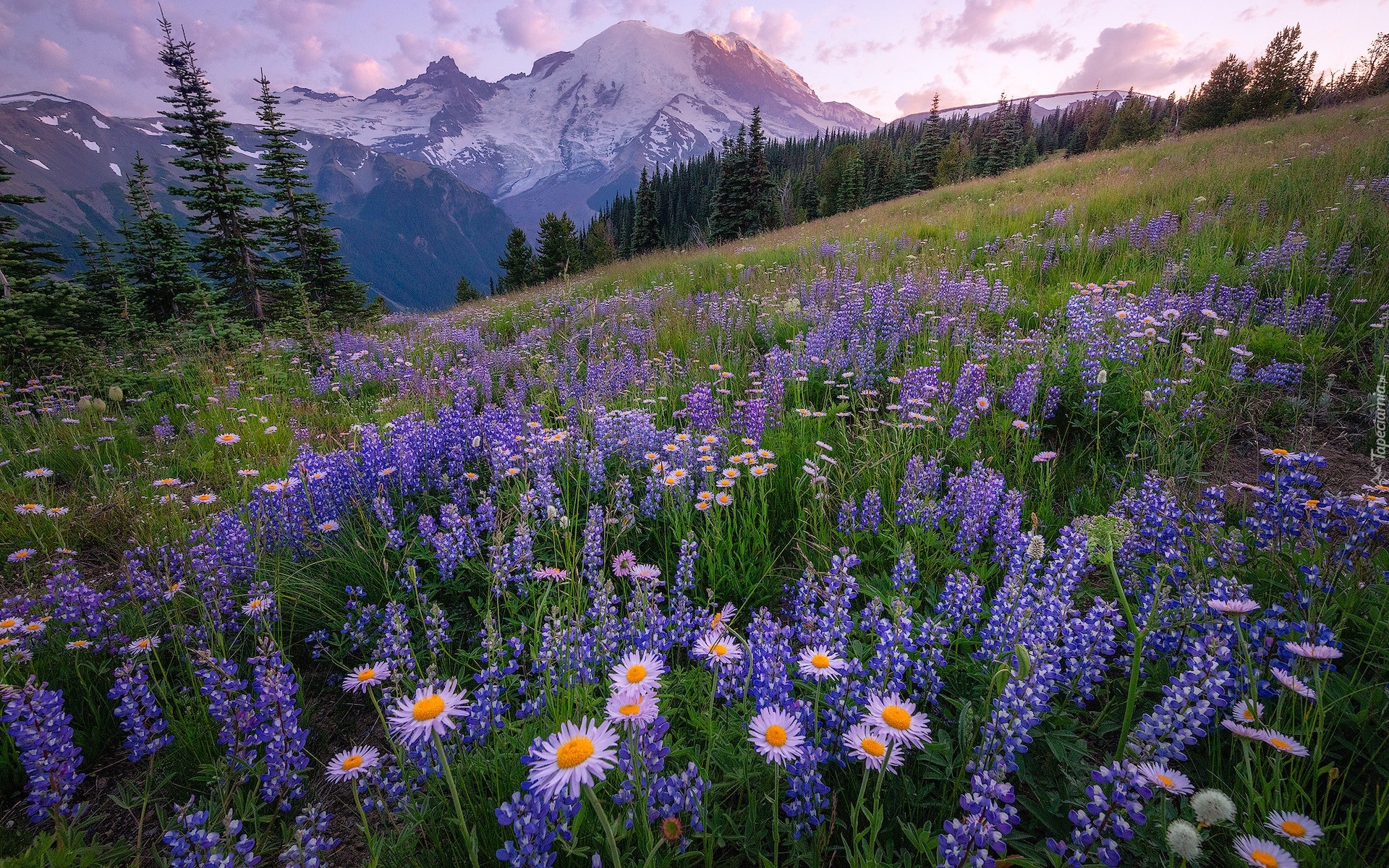 Tagi: Stany Zjednoczone, Stan Waszyngton, Góry, Park Narodowy Mount Rainier, Stratowulkan, Wzgórze, Łąka, Astry, Łubin