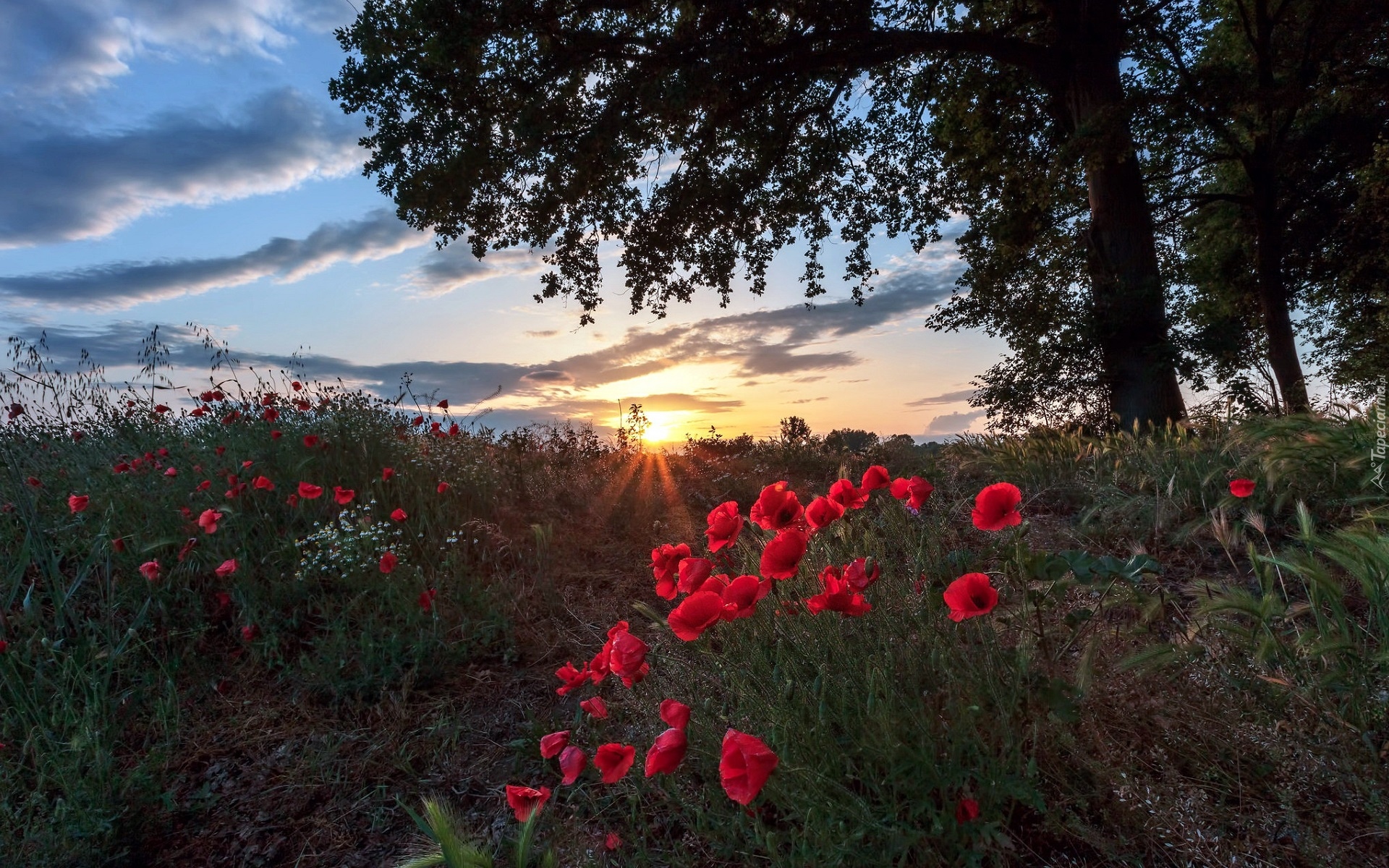 Tagi: Zachód słońca, Pole, Kwiaty, Maki, Rumianki, Kłosy, Zboże, Drzewa