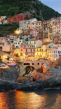 Tagi: Włochy, Prowincja La Spezia, Region Liguria, Gmina Riomaggiore, Miejscowość Manarola, Morze Liguryjskie, Kolorowe, Domy, Skały, Zatoczka, Światła