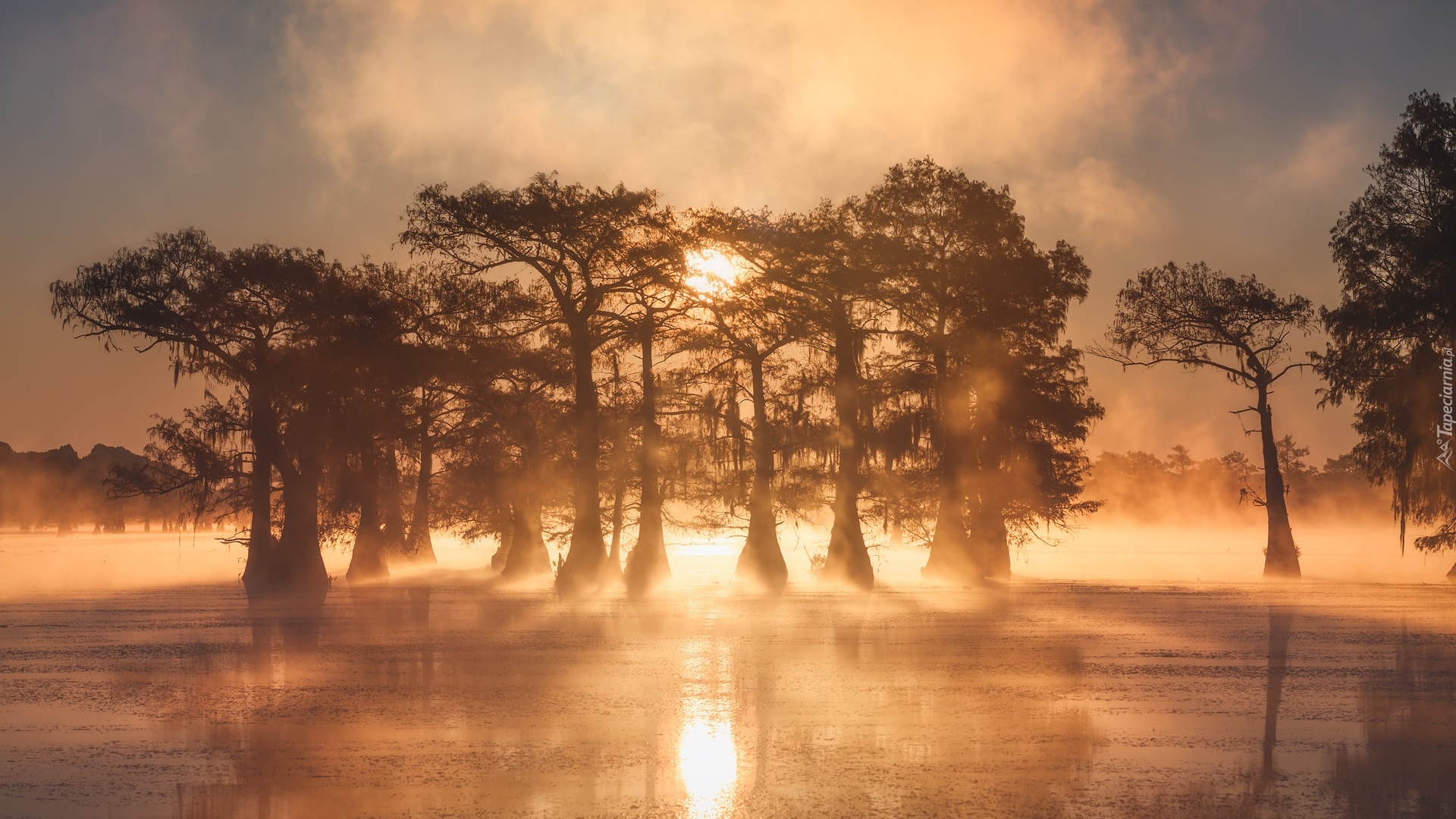 Tagi: Drzewa, Cyprysy bagienne, Wschód słońca, Mgła, Chmury, Bagno