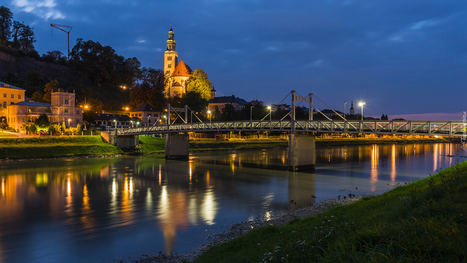 Tagi: Austria, Salzburg, Domy, Kościół, Rzeka Salzach, Most, Roślinność, Wieczór