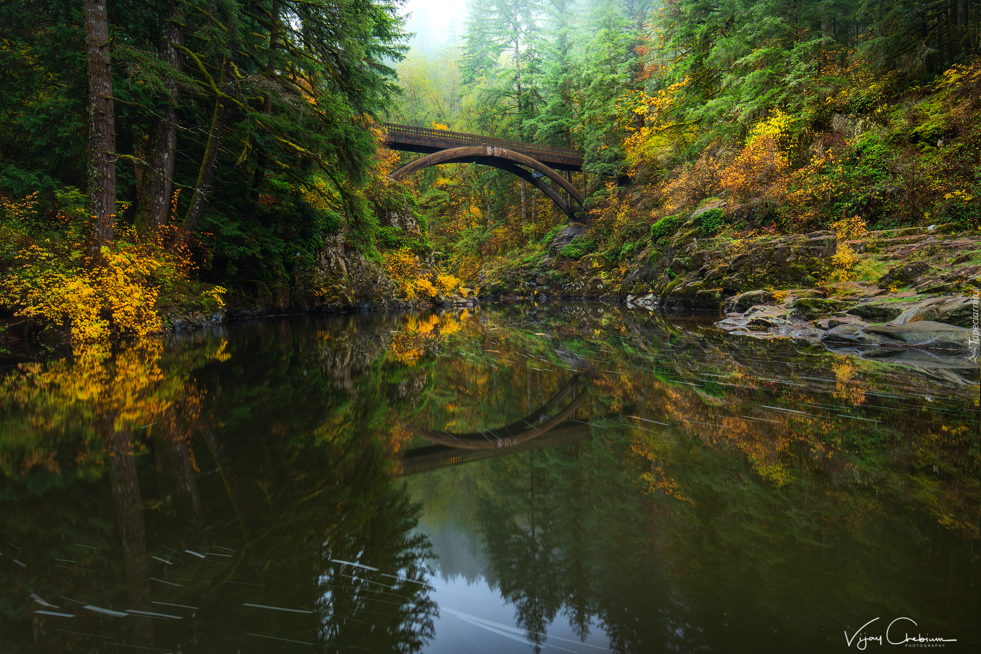 Tagi: Las, Rzeka Lewis River, Most Moulton Falls Bridge, Skały, Stan Waszyngton, Stany Zjednoczone