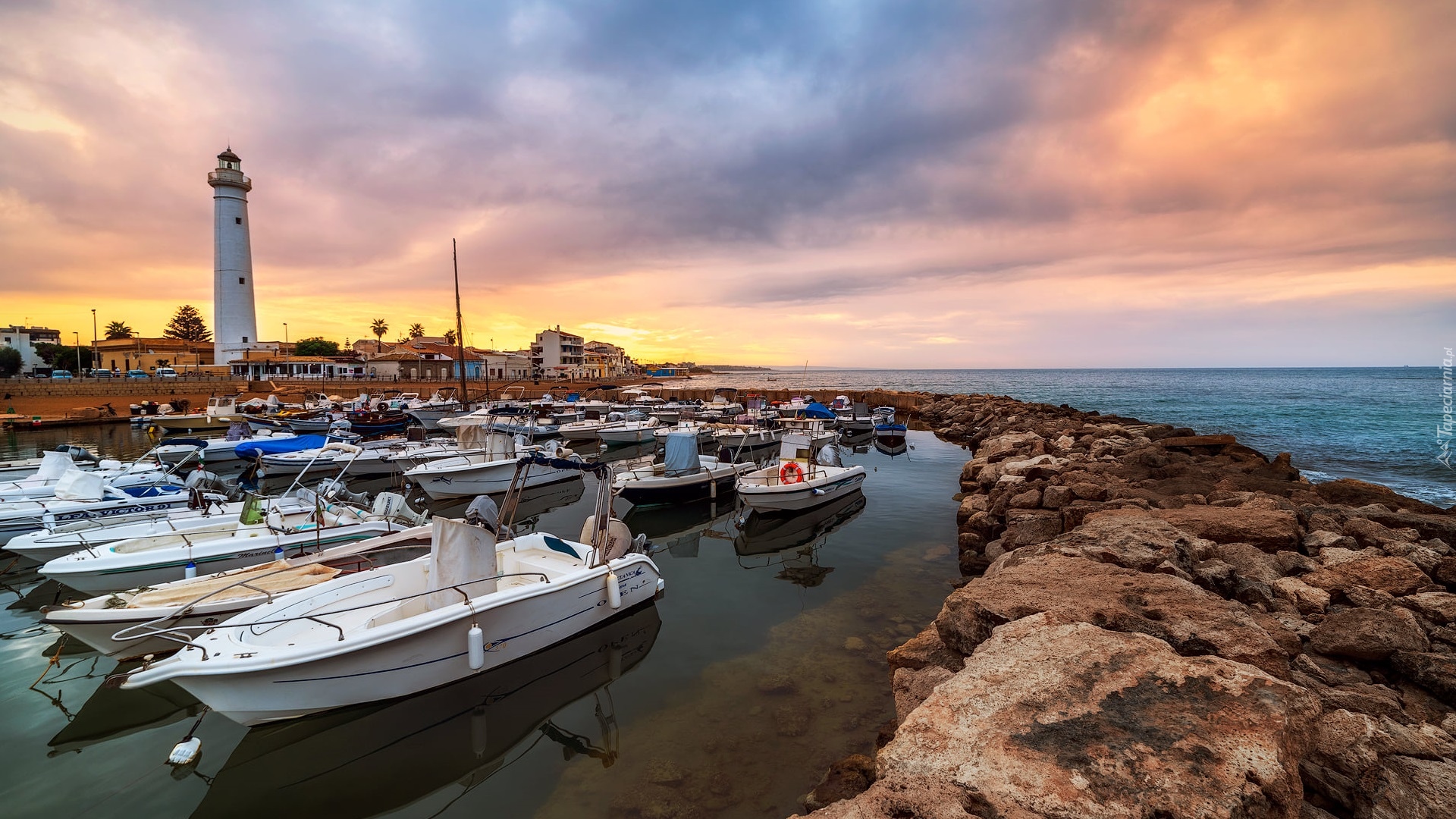 Morze, Latarnia morska, Przystań, Motorówki, Kamienie, Wschód słońca