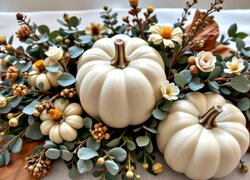 Biała dynia wśród listków i kwiatów