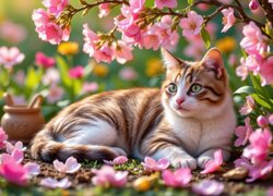 Biało-rudy kot leżący pod ukwieconą gałązką