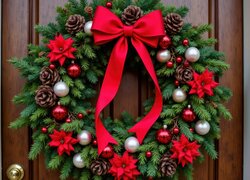 Bombki i duża czerwona kokarda na świątecznym wieńcu