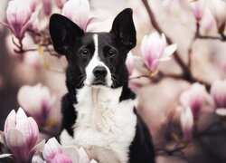 Border collie na tle magnolii