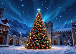 Choinka udekorowana bombkami na dziedzińcu w zimową noc