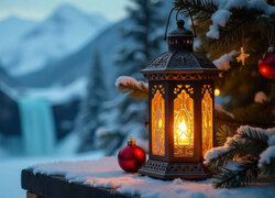 Tapeta z największą ilością wyświetleń: Zapalona latarnia obok udekorowanej choinki oraz oświetlony dom przy zakręcie w zimowej scenerii, dodana przez Ewa15 Gratulujemy!