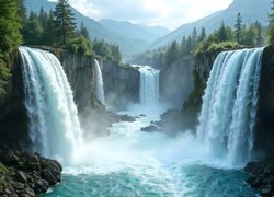 Drzewa i wodospady spływające po skałach do rzeki