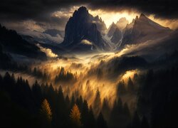 Drzewa spowite mgłą oraz szczyty gór w blasku zachodzącego słońca