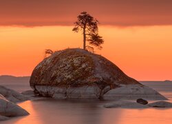 Drzewo na skale na jeziorze pod pomarańczowym niebem
