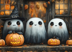 Duszek w czarnym kapeluszu ze świecącą dynią przed domem