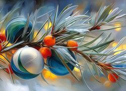 Duże kolorowe bombki i owoce na iglastej gałązce