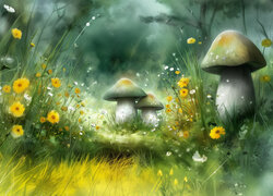 Dwa grzyby i kwiaty w trawie w grafice AI