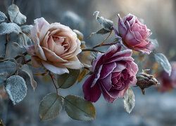 Dwie oszronione róże i liście na gałązce
