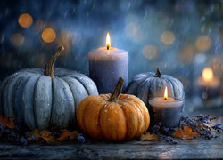 Dwie zapalone świece obok dwóch dyń w padającym deszczu