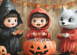 Dziecko w czarnym ubranku obok dyni na Halloween