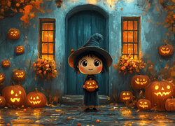 Dziecko w kapeluszu ze świecącą dynią przed drzwiami domu