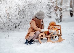 Dziewczynka na sankach z lisem