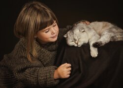 Dziewczynka w wełnianym swetrze obok śpiącego kota