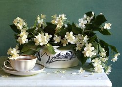 Filiżanka herbaty i bukiet jaśminu