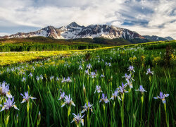 Fioletowe irysy na łące i ośnieżone góry w oddali