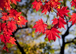 Jesień Kanady- czerwone liście klonu które łopoczą wiatrem.