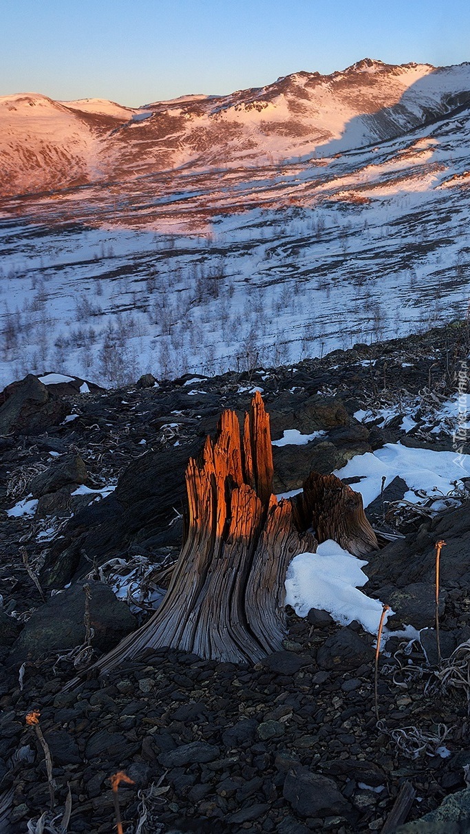 Góry i pień drzewa oświetlone słońcem