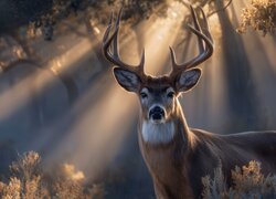 Jeleń w smugach przebijającego światła między drzewami