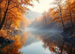 Jesienne drzewa nad zamgloną rzeką