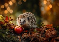 Jeż obok czerwonego jabłka na suchych liściach