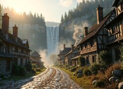 Kamienne domy przy brukowanej drodze z widokiem na wodospad na skałach