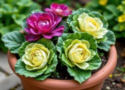 Kapusty ozdobne z zielonymi i bordowymi liśćmi w donicy